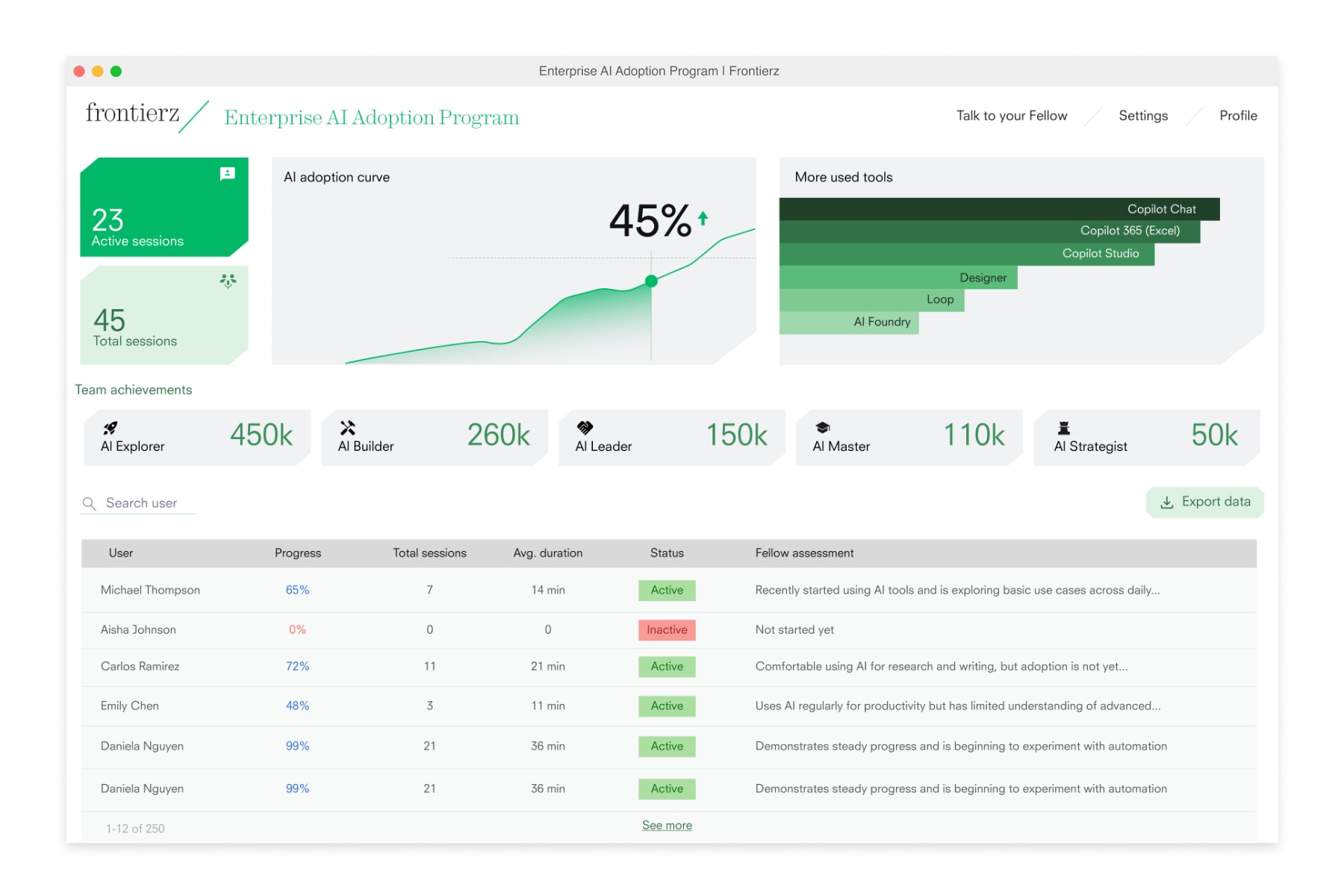 Through the program, the organization gains real-time visibility into AI adoption across teams and roles.